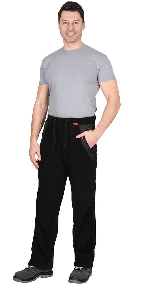 Ткань верха: "флис"; плотность 260 г/кв.м.; состав: 100% п/э.Отделочная ткань: " Дюспо" пл. 75г/м2 ; 100% п\э ; Брюки прямого покроя; с притачным поясом стянутым эластичной тесьмой и шнуром с фиксаторами, с боковыми вертикальными карманами, застегивающимися на тесьму-"молния". На брюках располагаются декоративные вставки из ткани Дюспо, сверху в области бокового шва и снизу по шаговому шву. ГОСТ 25295-2003