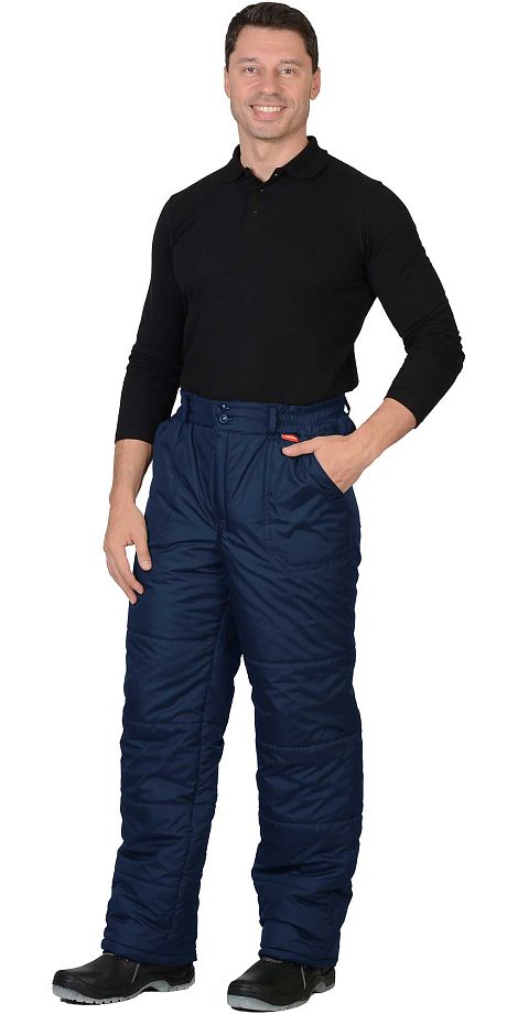 Брюки прямые, утеплённые, с центральной застежкой на тесьму "молния", притачным поясом с эластичной лентой по бокам, с застежкой на две обметанные петли и пуговицы, с пятью шлёвками: две на передней, три на задней части пояса; с боковыми карманами, задним карманом с клапаном на липучке.