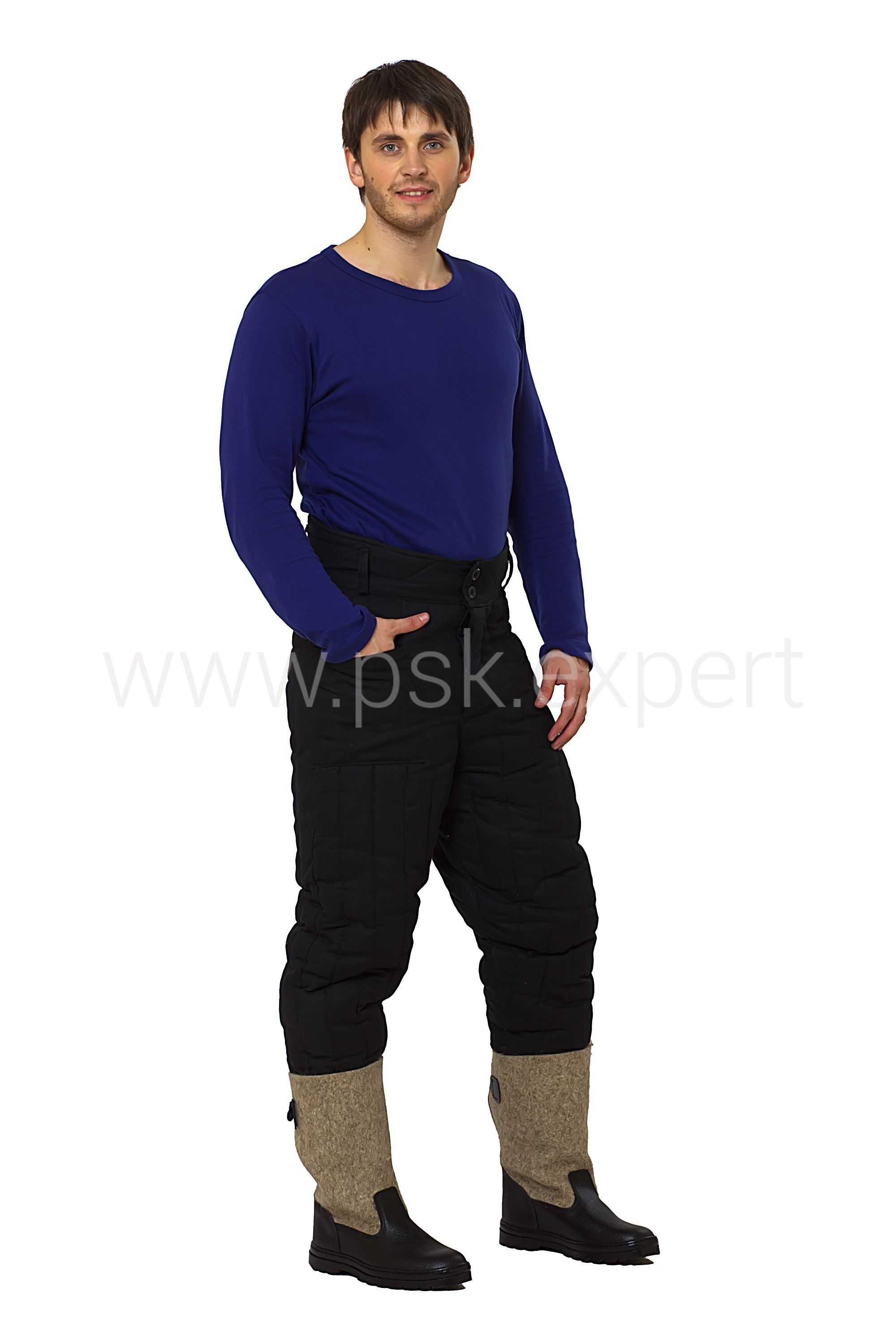Брюки ватные с высоким утепленным поясом, центральной застежкой на пуговицы, спереди имеются два накладных кармана. Предусмотрены шлевки под широкий ремень.