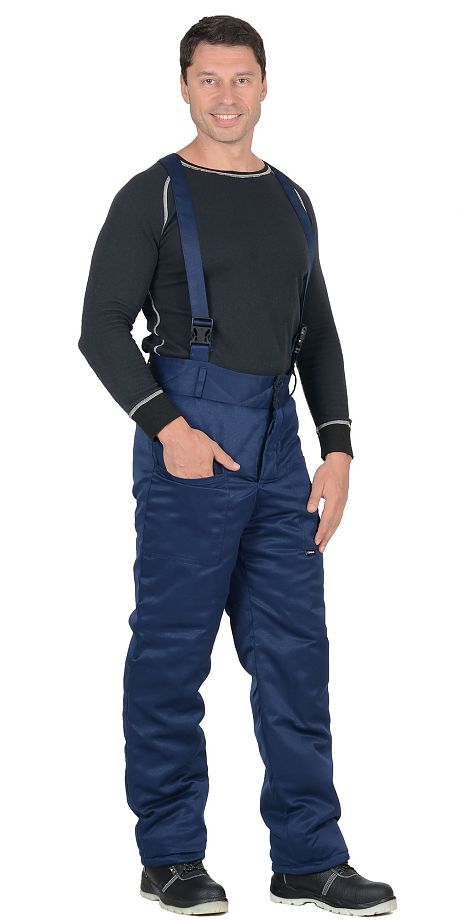 Тк. смесовая, ВО, 80% п/э, 20% х/б., пл. 210 г/кв.м. Синтепон 240 г/кв.м. Подкладка: 100% п/э. Брюки с широким поясом, с фигурной линией верхнего края с застежкой на пуговицы, узкими шлевками, регулируемыми съемными бретелями, боковыми накладными карманми. ГОСТ 25295-2003.