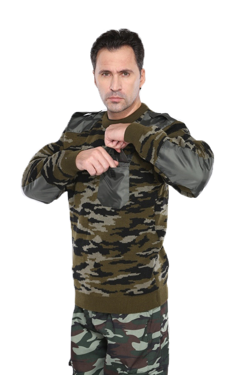 Джемпер трикотажный с круглой горловиной и с усилительными накладками в области плеч и локтей из водоотталкивающей ткани, а также погоны и накладной карман. Рекомендуется использовать с костюмами зимнего ассортимента, в т.ч. с костюмами охранника и как самостоятельную модель. Вывязанная резинка по низу изделия и рукавов.