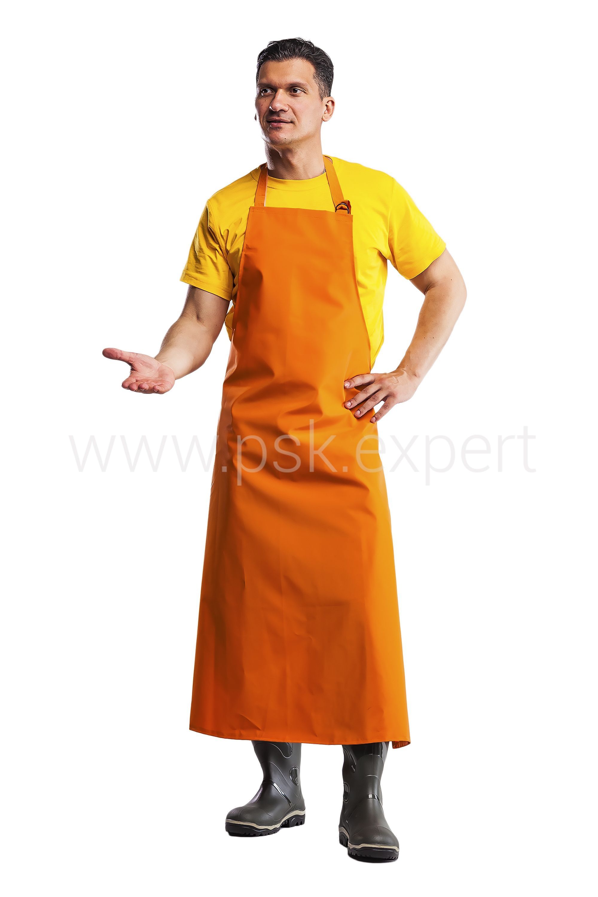 Фартук удлиненный с грудкой, шейная бретель регулируется по длине. Регулировка по объему осуществляется завязками. Изготовлен из специальной прочной ткани с ПВХ покрытием, стойкой к действию морской воды, рыбьего жира, нефтепродуктов. Ткань экологична и соответствует европейскому стандарту EN713.