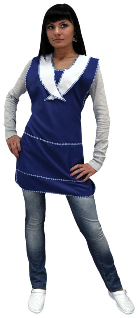• Фартук с декоративным воротником из белой ткани, с одним накладным карманом, расстроченным на части. Окантовка из ткани в контрастную полоску. По талии объем регулируется при помощи полупоясов. Рекомендуется для работниц сферы обслуживания, технического персонала гостиниц, для работников торговли.