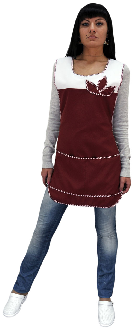 • Фартук с декоративным воротником, с большим функциональным карманом, разделенным на две части. По талии объем регулируется при помощи полупоясов. Эту модель выделяет контрастное сочетание цвета и изящная аппликация на груди в виде цветка. Рекомендуется для работниц сферы обслуживания, технического персонала гостиниц, для работников торговли.