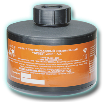 Фильтр Бриз-2003 А2Е1АХ предназначены для очистки вдыхаемого человеком воздуха от присутствующих в воздухе рабочей зоны паров и газов опасных органических соединений с температурой кипения не более 65°С, таких, как метан, этан, бутан, этилен, ацетилен и т.п.