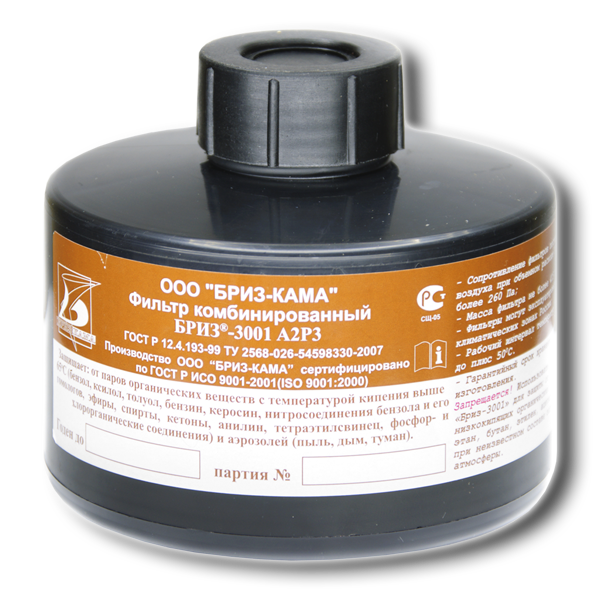 Корпус фильтра изготовлен из специальной пластмассы. Соединительная резьба соответствует ГОСТ Р 12.4.214-99 (40х3,5 мм). Фильтр комбинированный Бриз-3001 А2P3D используется в составе фильтрующего противогаза с полнолицевой маской.