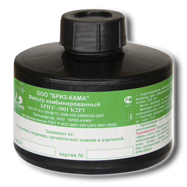 Фильтр комбинированный Бриз-3001 К2Р3D предназначен для очистки загрязнённого воздуха от аэрозольных частиц малотоксичных веществ, содержащихся в пыли, дыме или тумане, а также от аммиака и аминов.