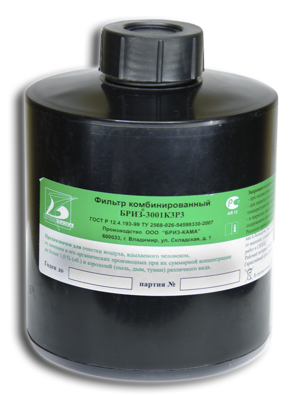 Корпус фильтра изготовлен из специальной пластмассы. Соединительная резьба соответствует ГОСТ Р 12.4.214-99 (40х3,5 мм). Фильтр комбинированный Бриз-3001 К3P3D используется в составе фильтрующего противогаза с полнолицевой маской.
