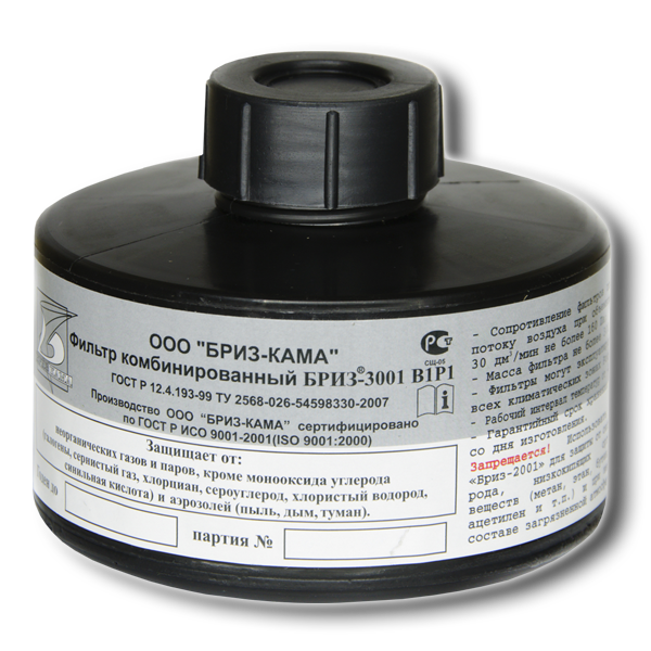 Корпус фильтра изготовлен из специальной пластмассы. Соединительная резьба соответствует ГОСТ Р 12.4.214-99 (40х3,5 мм). Фильтр комбинированный Бриз-3001 B1P1D используется в составе фильтрующего противогаза с полнолицевой маской.