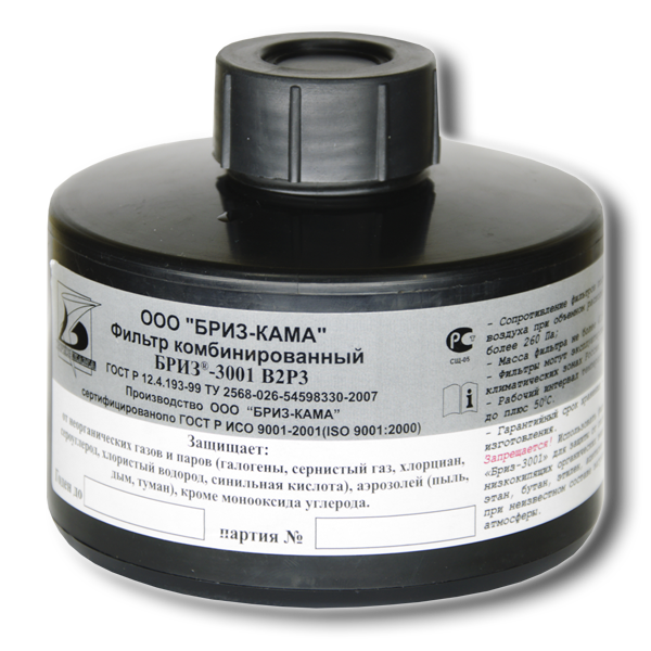 Фильтр комбинированный Бриз-3001 B2Р3D предназначен для очистки загрязнённого воздуха от аэрозольных частиц, малотоксичных веществ, содержащихся в пыли, дыме или тумане, а также от неорганических газов и паров (например, галогены, сероводород, синильная кислота, хлорциан, сероуглерод), кроме оксида углерода.
