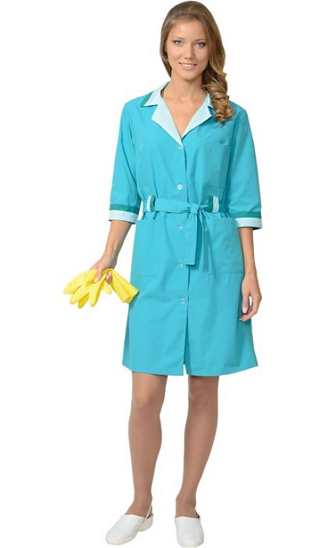 Тк. смесовая, 65% п/э, 35% х/б, 120 г/кв.м. Халат укороченный, на пуговицах, с поясом, карманами. Воротник, манжеты, шлёвки из отд. ткани. ГОСТ 25294-2003