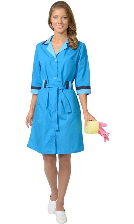 Тк. смесовая, 65% п/э, 35% х/б, 120 г/кв.м. Халат укороченный, на пуговицах, с поясом, карманами. Воротник, манжеты, шлёвки из отд. ткани. ГОСТ 25294-2003