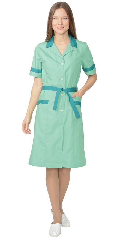 Тк. смесовая, 65%-п/э, 35%-х/б, 120 г/кв.м. Халат женский укороченный, полуприлегающего силуэта, с центральной застежкой на пуговицы, с рельефными швами, с одним верхним у двумя нижними накладными карманами, воротник отложной. По талии в шлевках продет пояс. ГОСТ 12.4.131-83