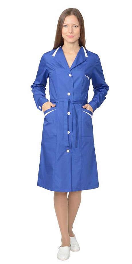 Тк. смесовая, 65%-п/э, 35%-х/б, 120 г/кв.м. Халат женский полуприлегающего силуэта, укороченный, с центральной бортовой застежкой на пуговицы, без воротника с лацканами с отделочной деталью, с нагрудным и нижними накладными карманами. Рукава длинные, регулируемые по длине при помощи хлястика из ткани отделка и пуговицы. Халат с завязывающимся спереди поясом. ГОСТ 12.4.131-83