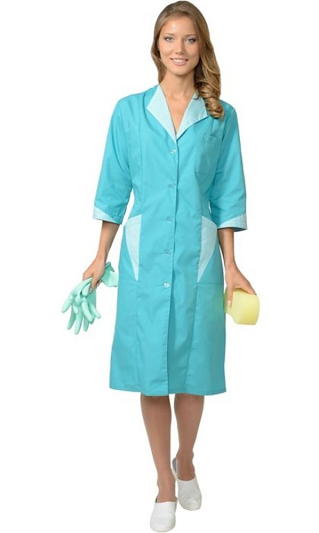 Тк. смесовая, 65% п/э, 35% х/б., пл. 120 гр./кв.м. Застёжка на пуговицы, рельефы. Воротник, часть нижних карманов и низ рукавов 3/4 из отделочной ткани. ГОСТ 12.4.131-83, ТО.