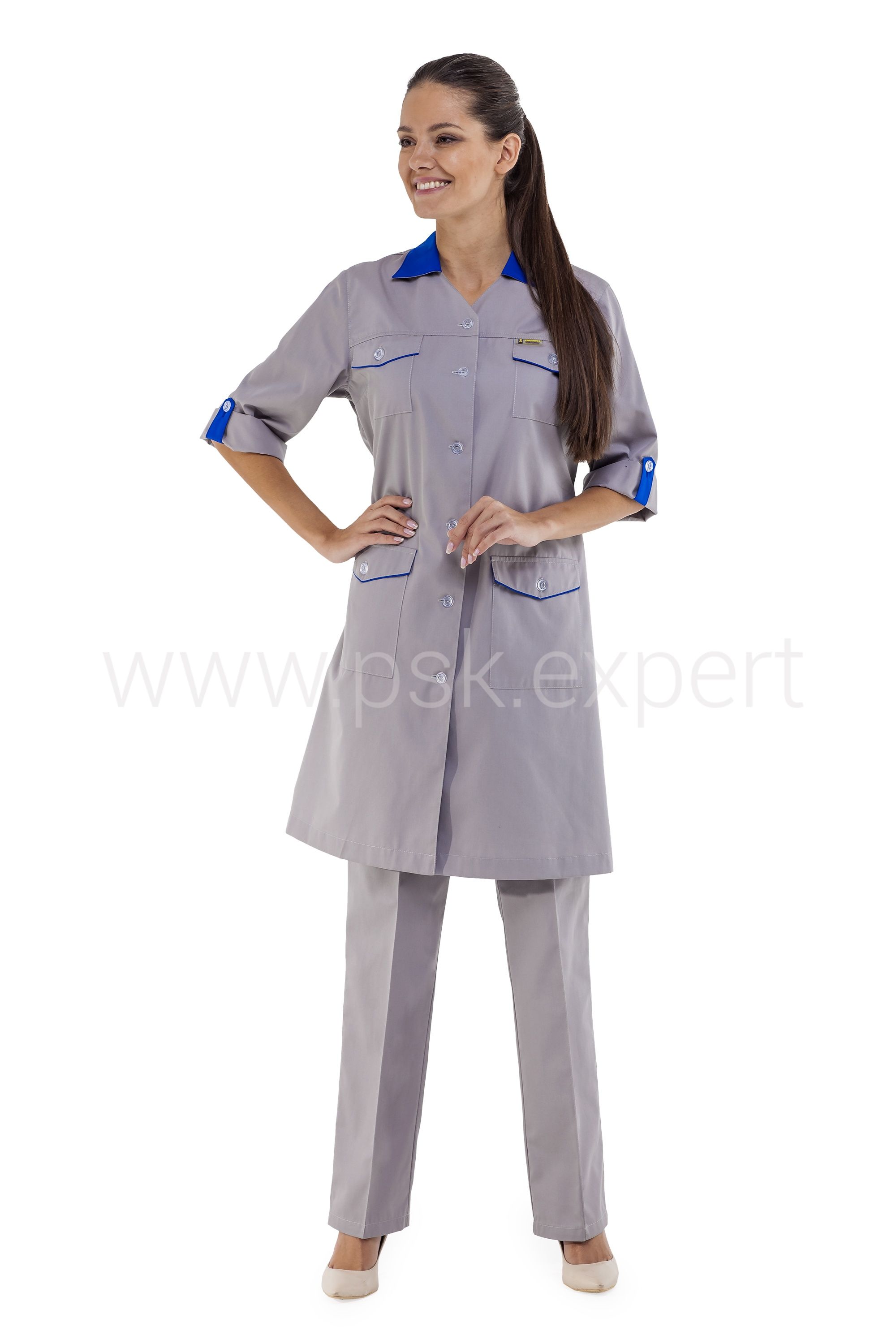 Рукава длинной 3/4 с возможностью регулировки по длине при помощи паты и пуговицы. Длина халата до середины колена, что позволяет носить халат как отдельным предметом так и в комплекте с брюками. Объем халата по талии регулируется завязывающимся поясом на спинке. Воротник и отделка клапанов выполнены из отделочной ткани.