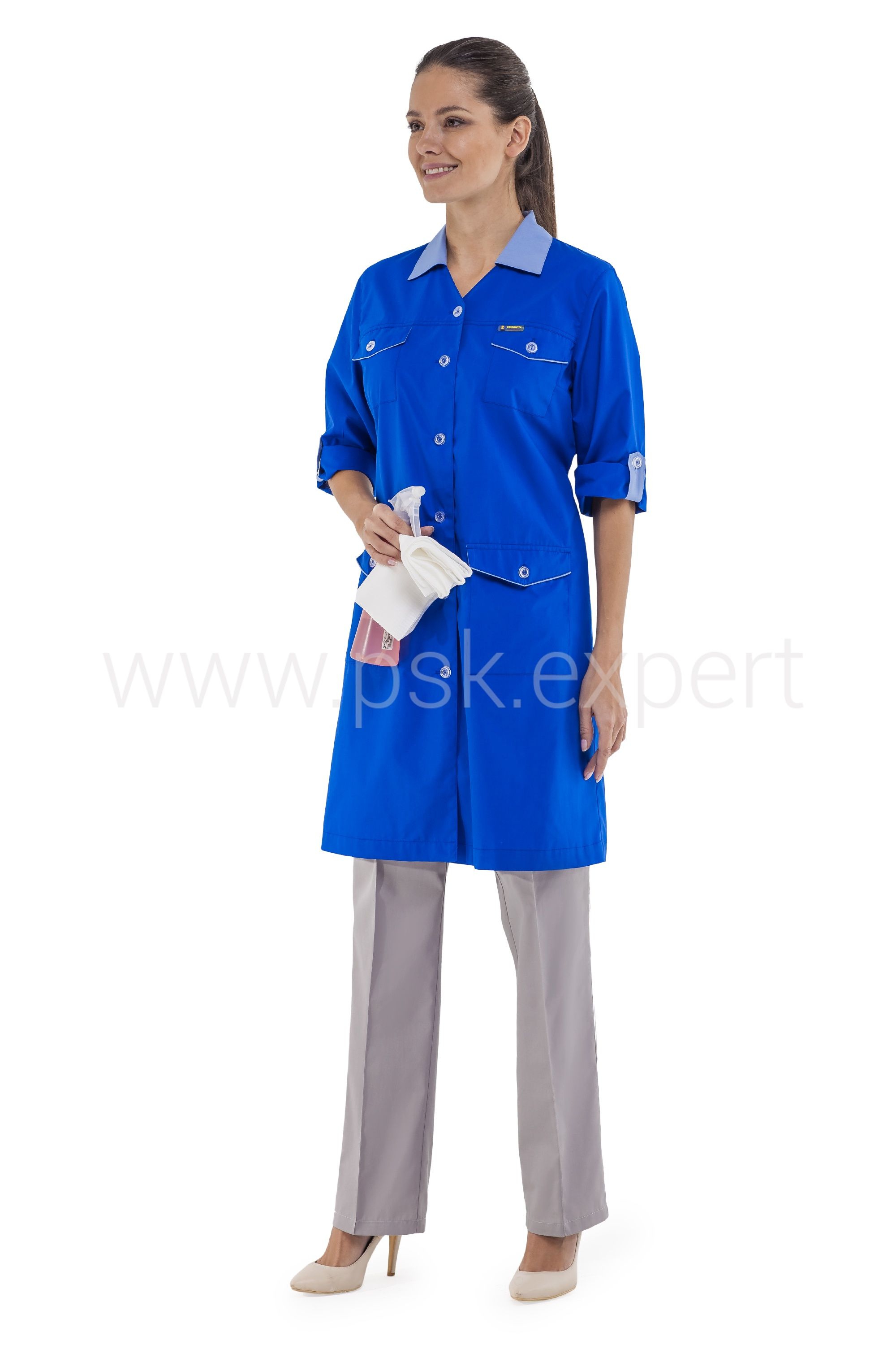 Рукава длинной 3/4 с возможностью регулировки по длине при помощи паты и пуговицы. Длина халата до середины колена, что позволяет носить халат как отдельным предметом так и в комплекте с брюками. Объем халата по талии регулируется завязывающимся поясом на спинке. Воротник и отделка клапанов выполнены из отделочной ткани.
