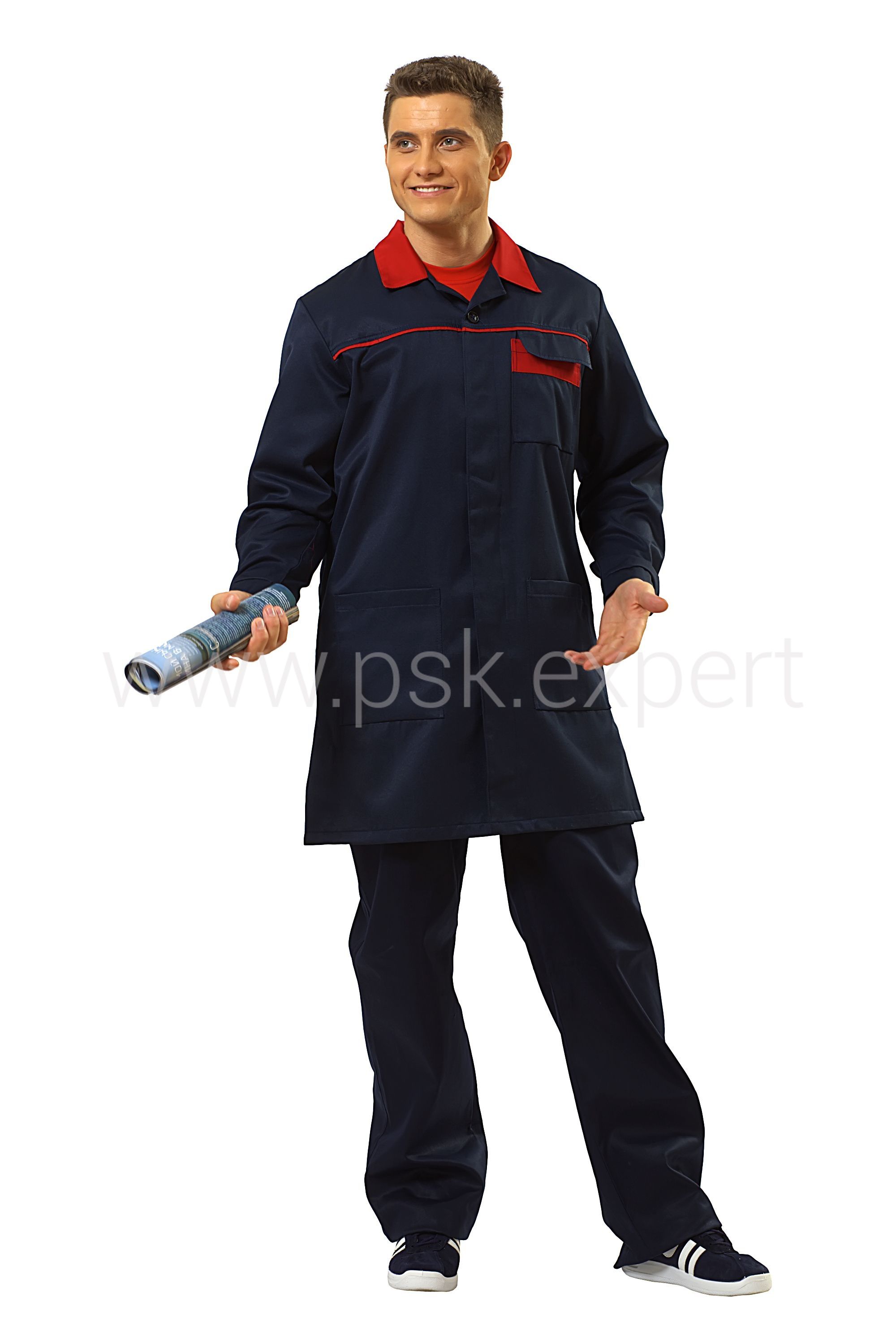 Халат с центральной потайной застежкой на пуговицы, с отложным воротником, одним нагрудным и двумя боковыми накладными кармарами. Рукава с манжетами, застегивающимися на пуговицы. Спинка со шлицей в среднем шве. Воротник, клапан и кант выполнены из контрастной ткани.