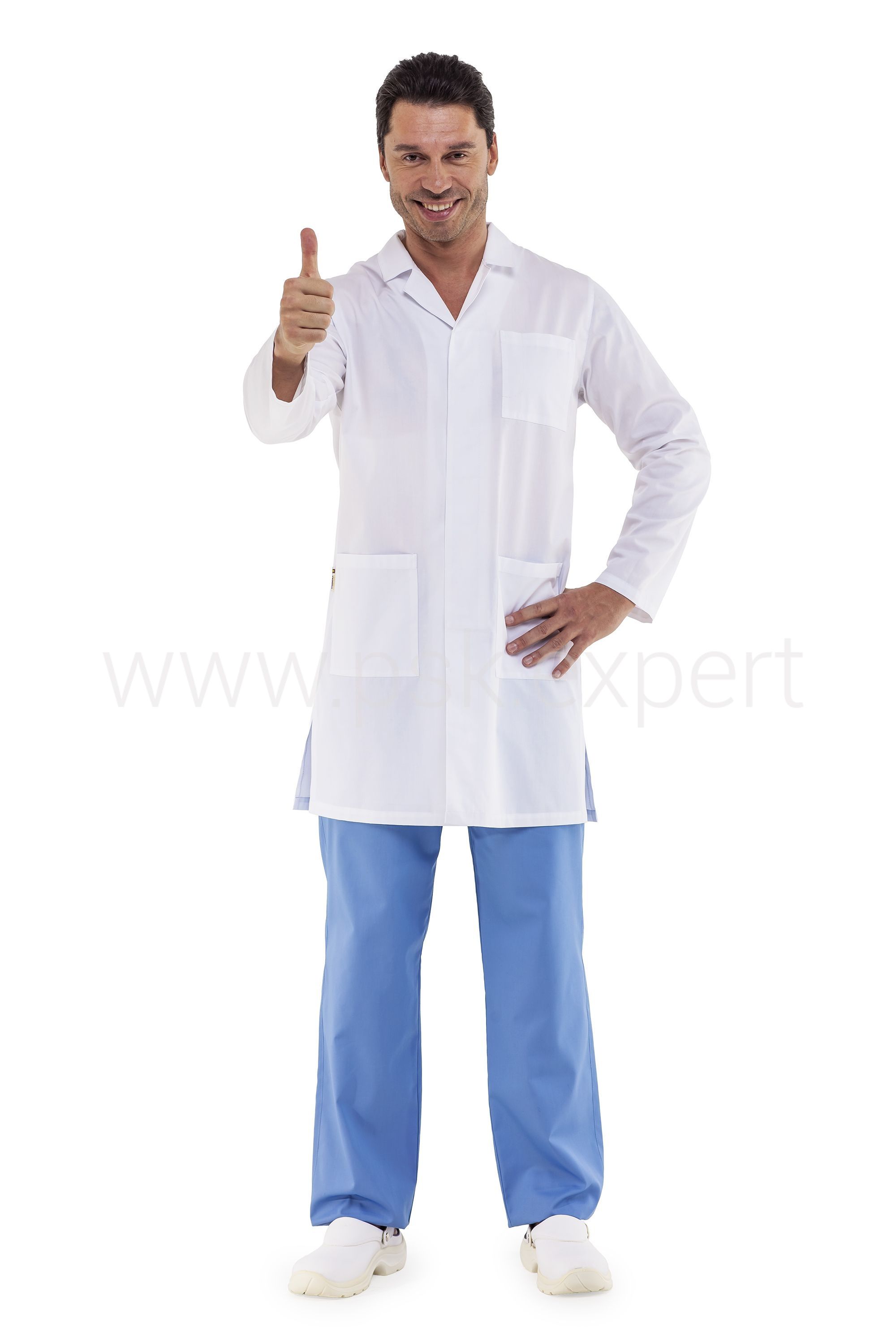Халат прямого силуэта с длинными рукавами, отложным воротником, с потайной застежкой на пуговицы. Два нижних кармана и один нагрудный карман с отделением для ручки. Разрезы в боковых швах.