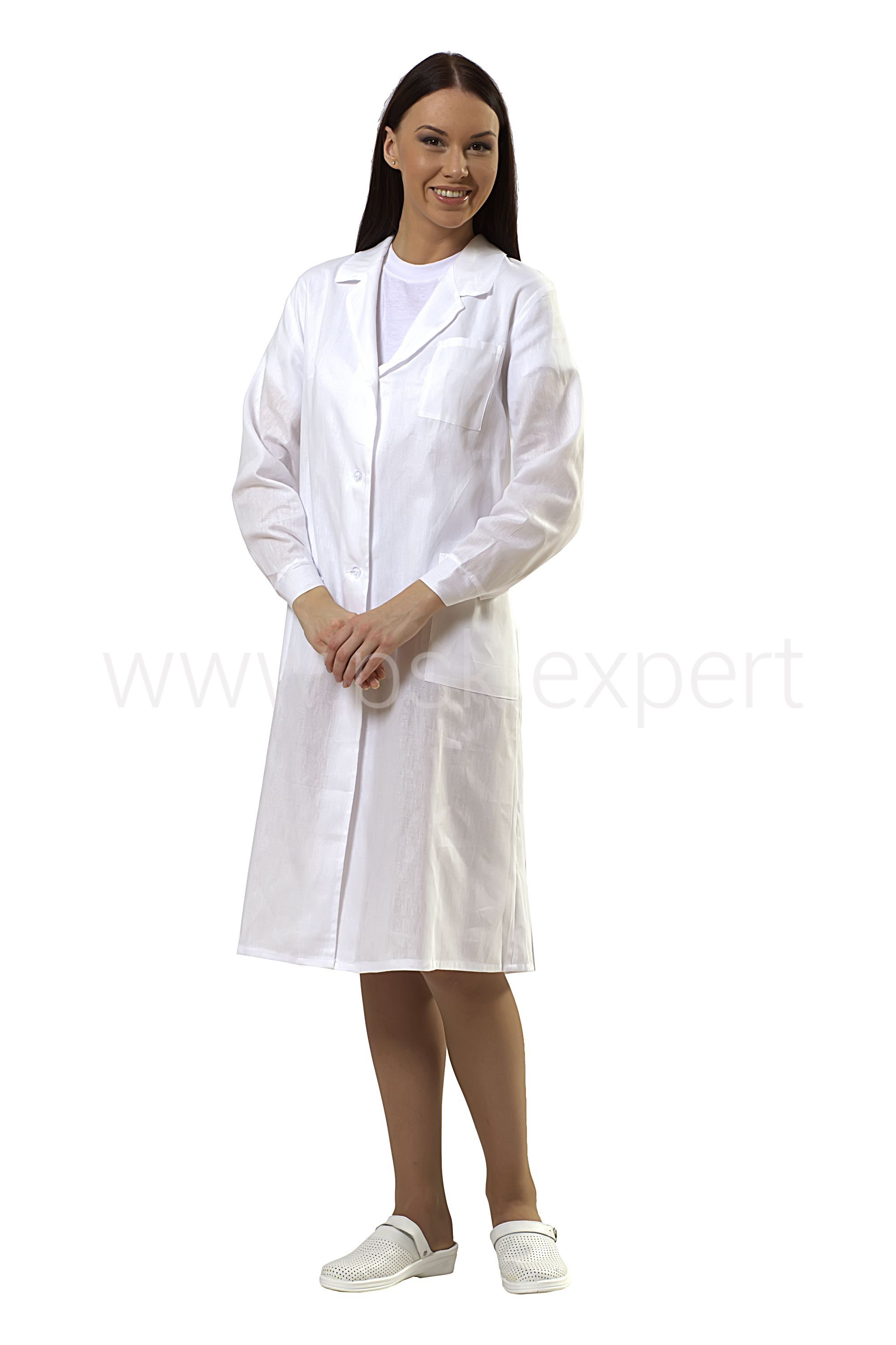 Халат с центральной застежкой на пуговицы, с отложным классическим воротником, одним нагрудным и двумя накладными боковыми карманами. Рукава с манжетами, застегивающимися на пуговицы.
