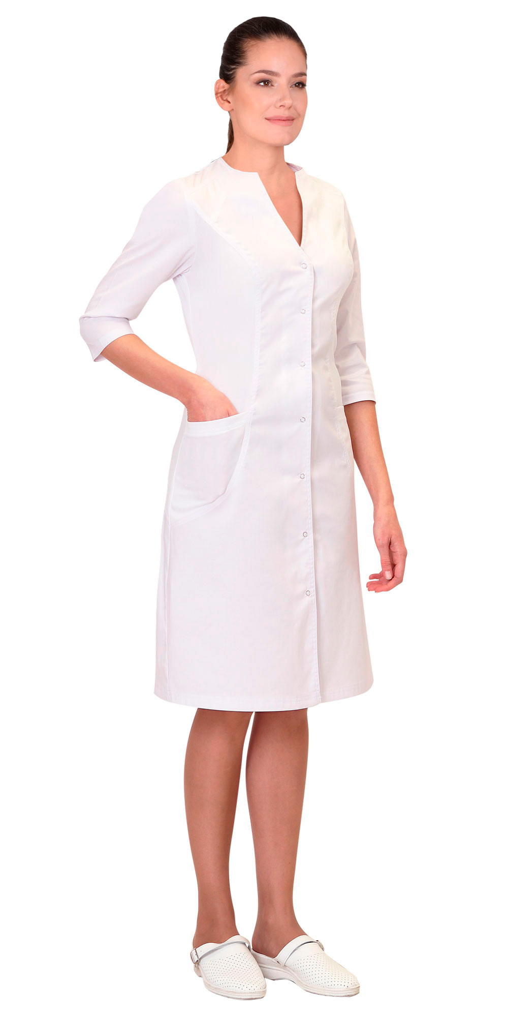 Халат полуприлегающего силуэта с центральной застёжкой на кнопки. Фигурный вырез горловины, без воротника. Рукава втачные, длинной 3/4. Боковые детали халата и два накладных карманы выполнены из трикотажной сетки.