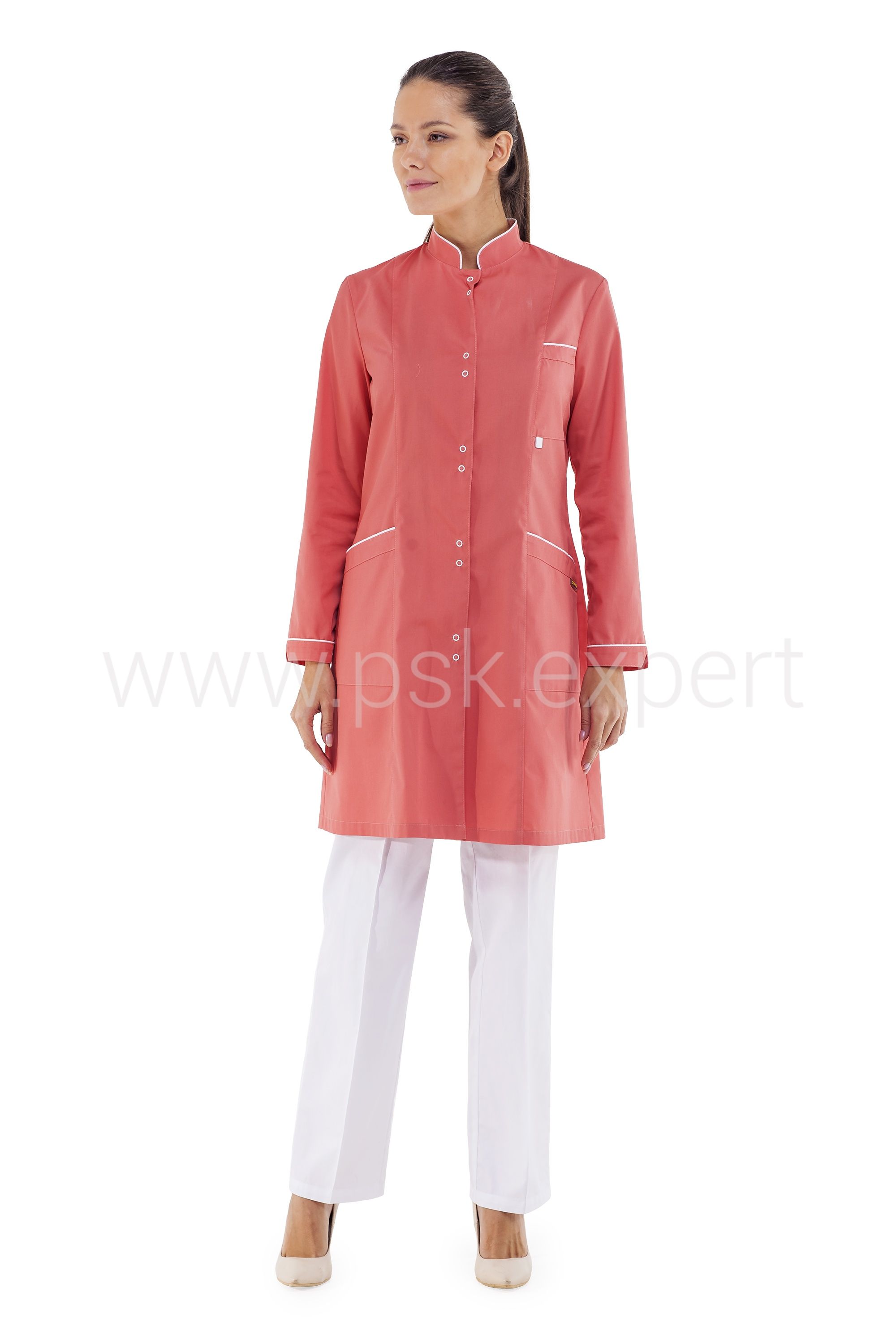 Халат полуприлегающего силуэта, с рельефами, с воротником-стойкой, с застежкой на кнопки. Два нижних кармана и один нагрудный карман с петлей для крепления бейджа. Длина халата до середины колена, что позволяет носить халат как отдельным предметом так и в комплекте с брюками. Отделка белым кантом по контуру стойки, карманам и низу рукавов.