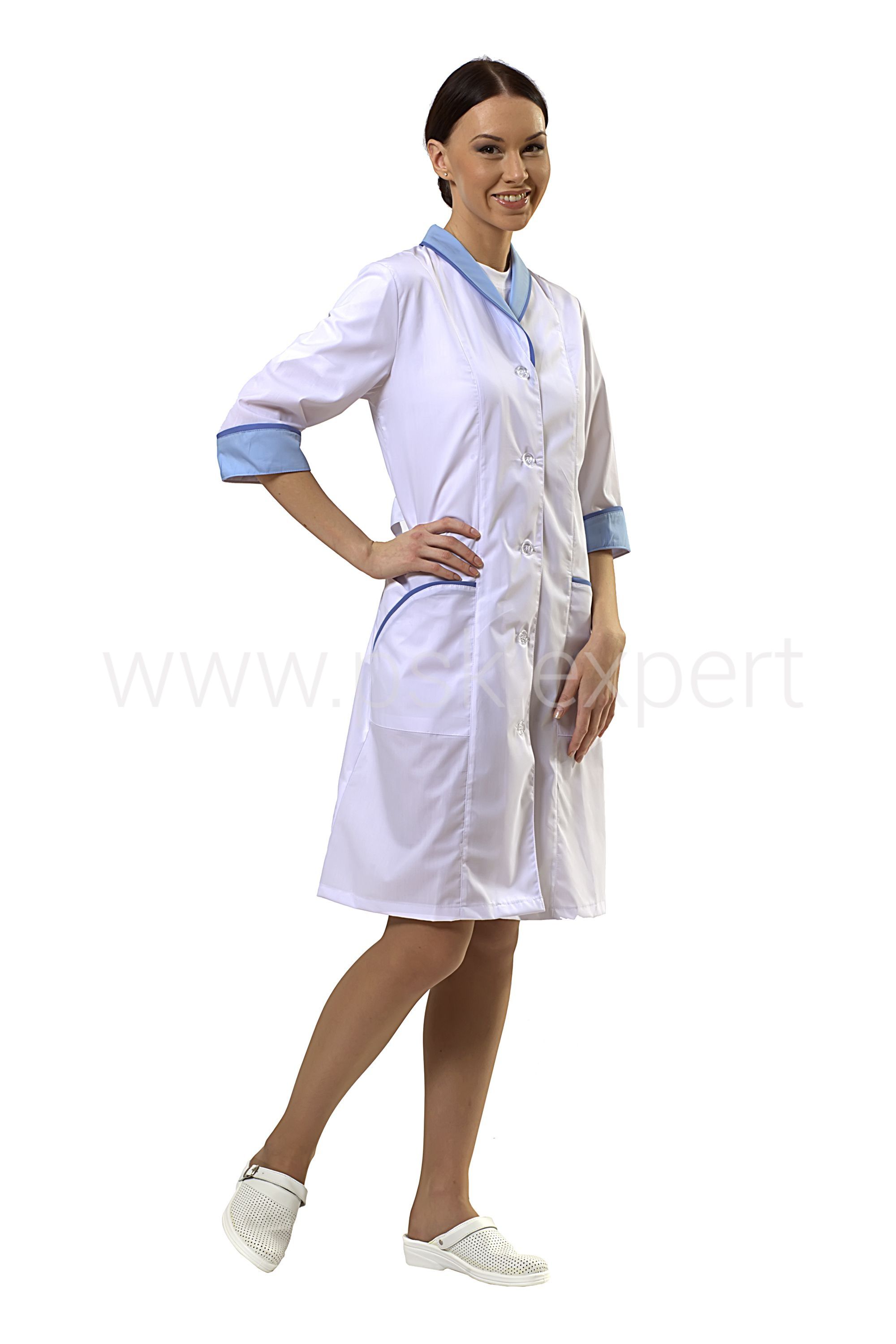 Халат прямого силуэта с центральной застежкой на пуговицы, воротником «шаль», рукавами длинной три четверти с манжетами внизу, двумя накладными карманами. Воротник, манжеты и фигурный край карманов выполнены из отделочной ткани и оформлены кантом. Объем по талии регулируется с помощью хлястика на спинке.