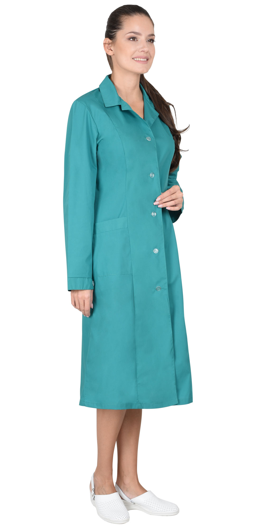 Классическая модель с нагрудным и двумя нижними накладными карманами, отложным воротником и длинными рукавами с манжетами. Ширина халата по линии талии регулируется хлястиком.