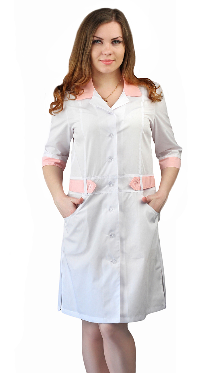 Халат полуприлегающего силуэта, с разрезами в боковых швах, с центральной бортовой застежкой на пуговицы, отрезной по линии талии с втачным поясом, с отложным воротником из ткани отделка, с лацканами, с нижними внутренними карманами. Рукава короткие, с притачной манжетой из ткани отделка.