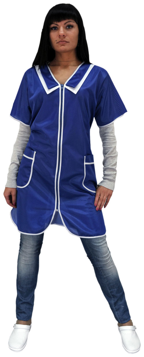 • Халат с декоративным воротником, с большим функциональным карманом, разделенным на две части. Рекомендуется для работниц сферы обслуживания, технического персонала гостиниц, для работников торговли.