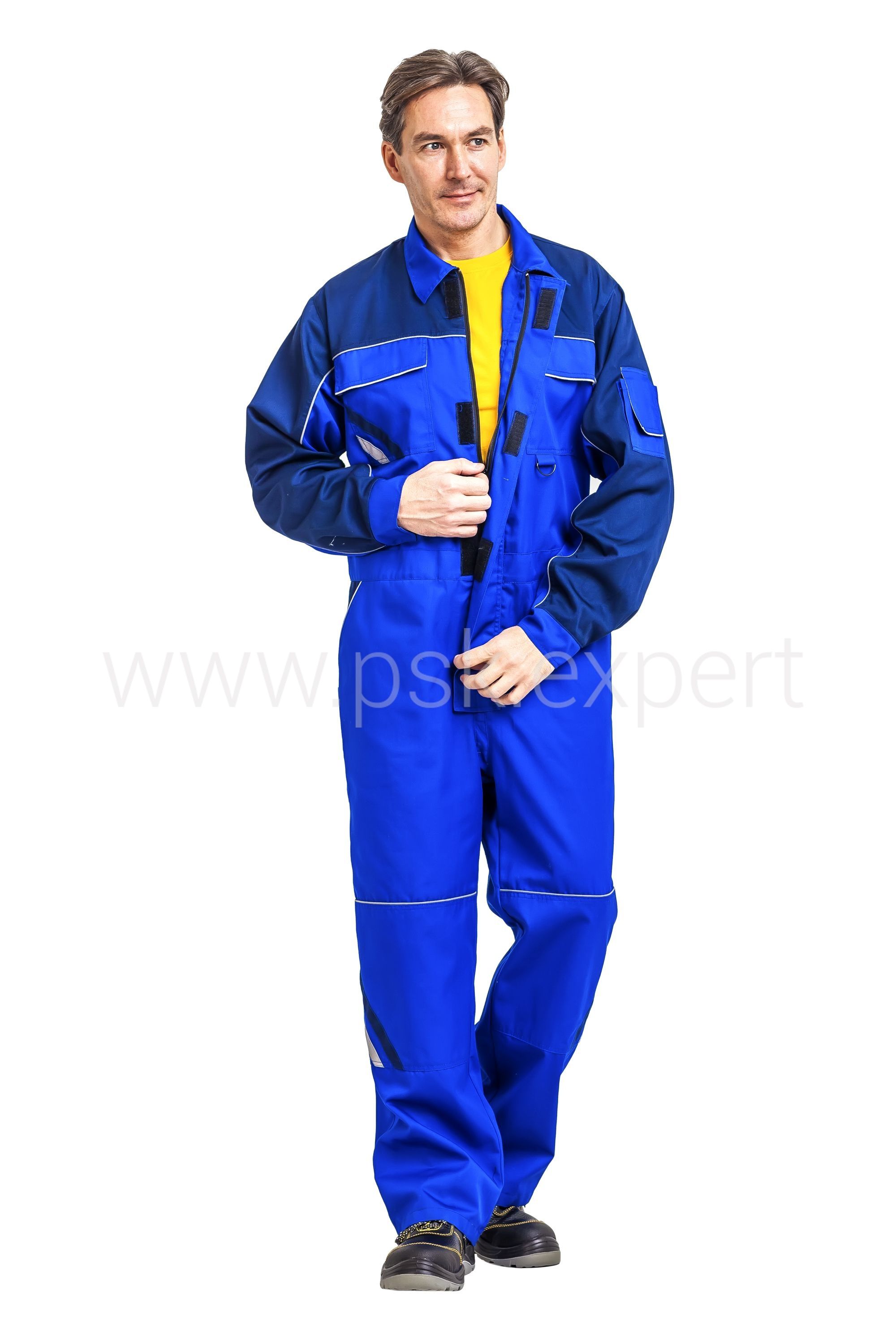 Комбинезон с центральной застежкой на двухзамковую молнию и ветрозащитную планку. На груди карманы с клапанами, с креплением для бейджа. В области подмышечных впадин вентиляционные отверстия с двойной сеткой. На левом рукаве карман для средств связи. Рукава на манжетах. Спинка стянута по линии талии эластичной тесьмой, две вертикальные складки на спинке обеспечивают свободу движения. На задней части брюк комбинезона накладной карман с клапаном, на уровне бедра удлиненный карман для инструментов. Светоотражающий кант по кокеткам, рукавам и усилительным накладкам в области колен.