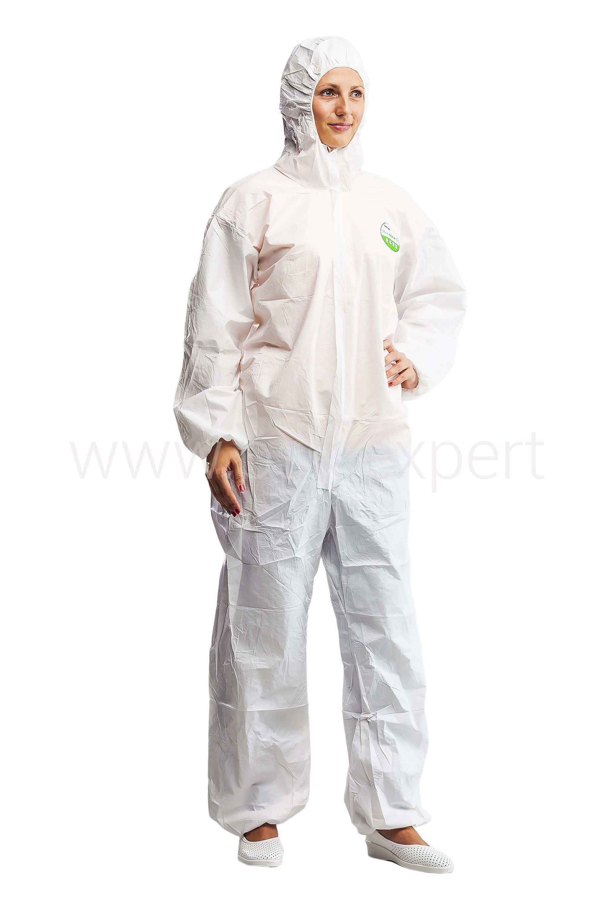 Комбинезон одноразовый из высококачественного микропористого многослойного материала: нетканого полипропилена, ламинированного прочной сетью и покрытого дышащей микропористой пленкой. Материал обладает хорошей воздухонепроницаемостью, не образует ворса и пыли. Обладает прекрасными защитными свойствами от опасной пыли и жидких химических веществ невысокой опасности. Антистатическая обработка (соответствует стандартам США - NFPA 99 и ЕС - EN1149). Защита от приносимых с кровью бактерий (соответствует ASTM F1670 и ASTM F1671). Особая конструкция комбинезона: капюшон из 3х частей, вставленные рукава, усиленные колени, двойная молния, эластичная резинка на поясе создают дополнительный комфорт. Предполагаемое использование: работа с радиоактивно зараженными частицами, с жидкостями невысокой опасности и опасными сухими частицами, грязные и малярные работы, очистка помещений, переноска и ликвидация асбеста, пищевая промышленность.
