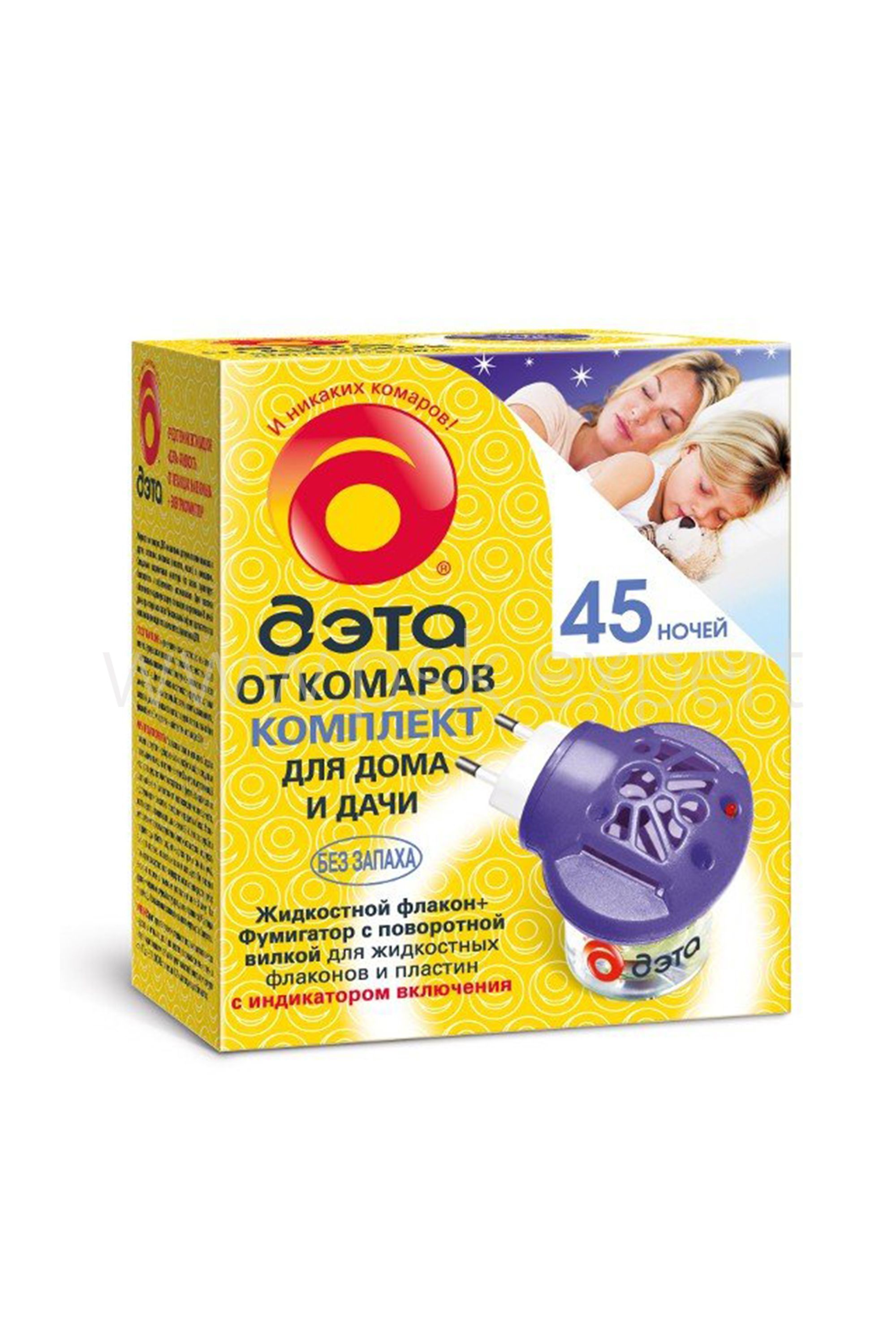 Комплект от комаров Дэта Insect незаменим для уничтожения комаров и других летающих насекомых (москитов, мошек) в помещении. Специально разработанная рецептура без запаха гарантирует безопасность и эффективность использования. Один флакон объемом 30 мл. рассчитан на работу в течение примерно 360 часов (45 ночей). Способ применения : Вынуть из упаковки флакон с раствором, снять защитный колпачок, ввернуть флакон в нагреватель до упора и включить его в электросеть на 220 В при вертикальном положении флакона. Полное уничтожение комаров достигается через 1 час. При открытых окнах и форточках электрофумигатор с флаконом можно оставлять включенным на всю ночь. Нагреватель выключить, флакон вывинтить, закрыть защитным колпачком и сохранять до следующего использования.