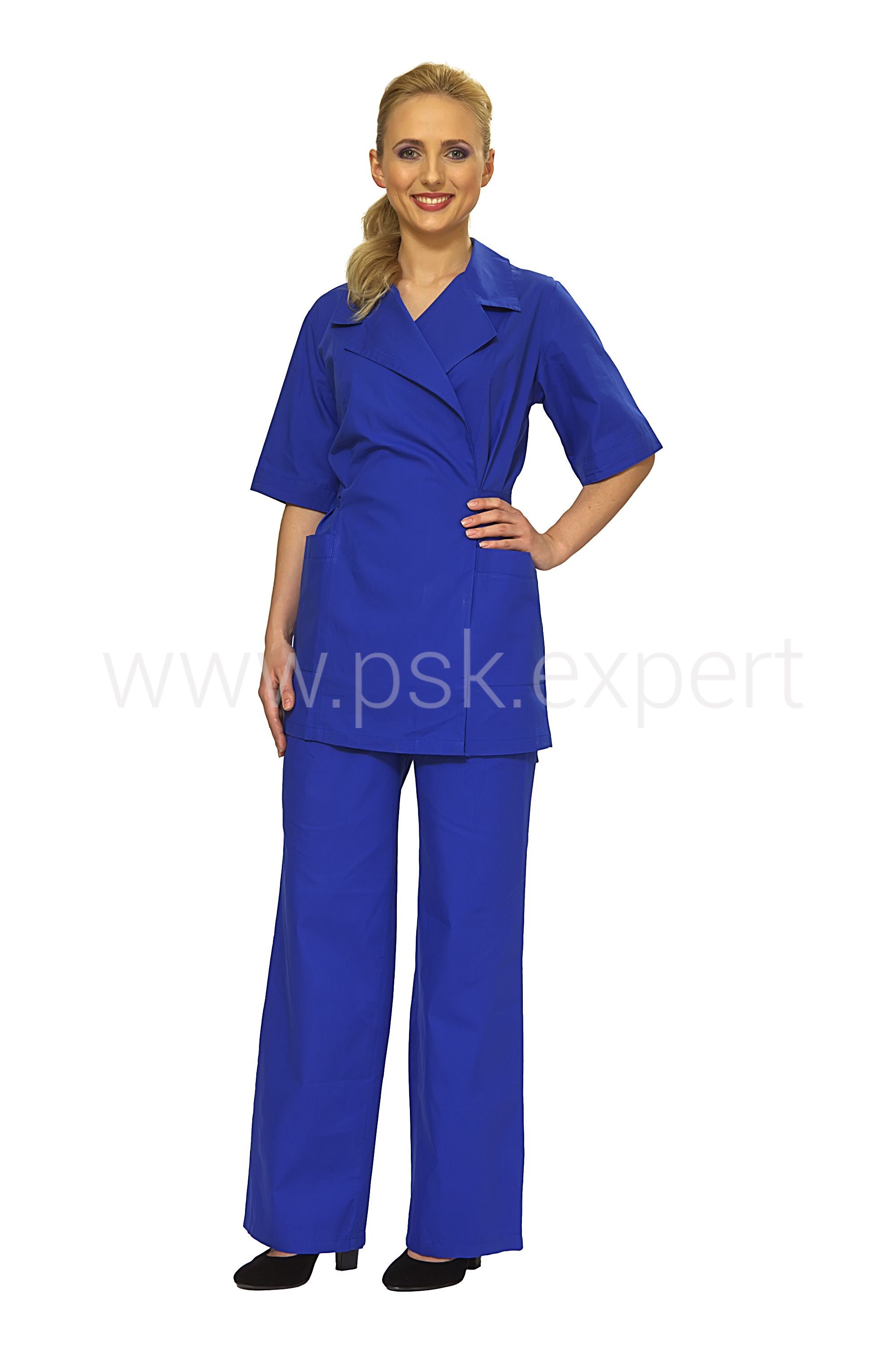 Комплект: блузон и брюки. Удлиненный блузон с запахом и отложным воротником, двумя накладными карманами. Объем по талии регулируется хлястиком. Брюки прямые, объем по талии регулируется с помощью эластичной тесьмы.
