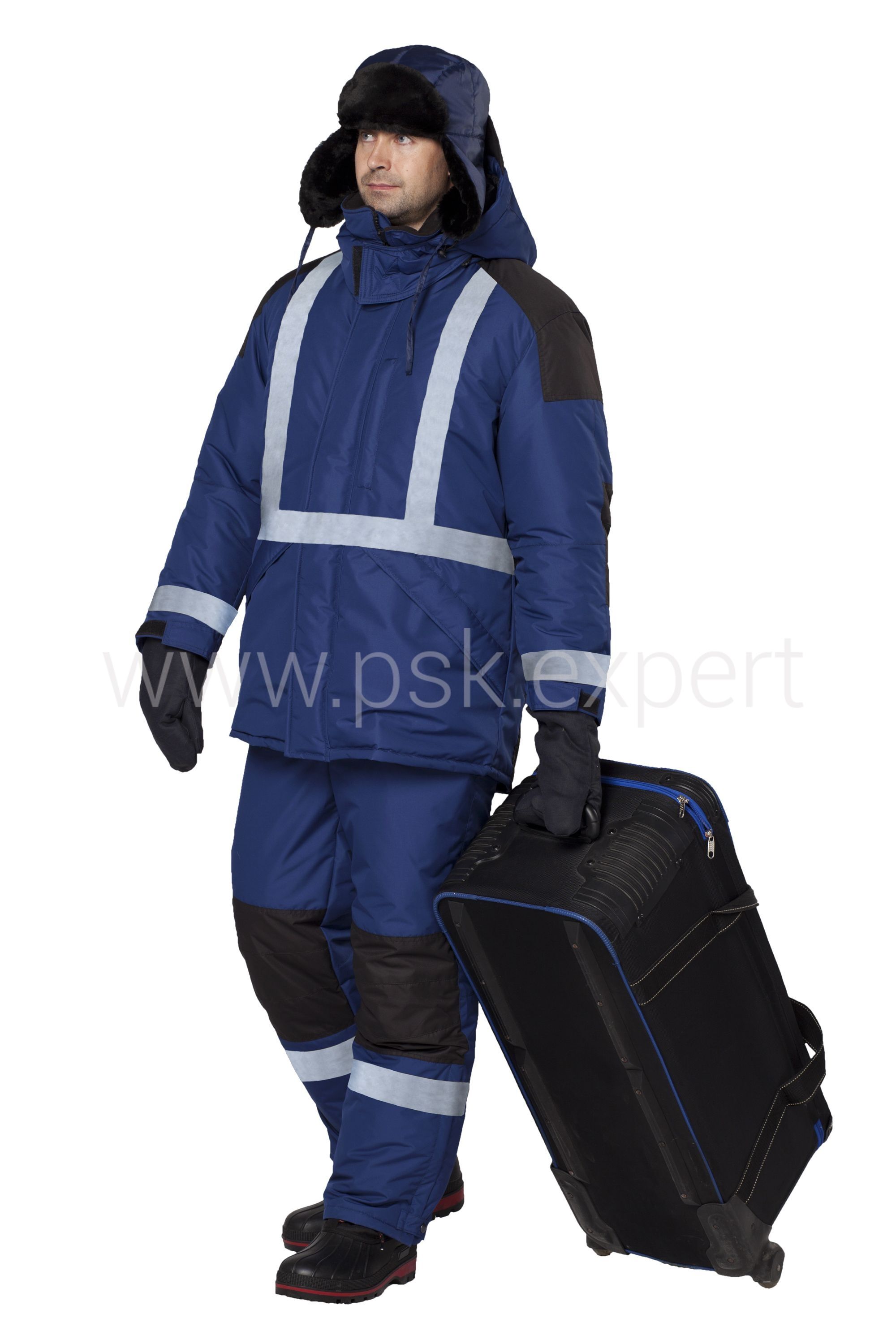 Костюм: куртка и полукомбинезон с лентой СОП. Класс защиты: 3 (IV климатический пояс). Удлиненная куртка с центральной застежкой на молнию и ветрозащитным клапаном имеет воротник-стойку, утепленный флисом, и отстегивающийся капюшон с регулировкой объема. Два объемных накладных кармана с клапанами и удобный карман на груди с застежкой на молнию. Имеется дополнительный пристегивающийся утеплитель с рукавами, трикотажными напульсниками и воротником-стойкой. Полукомбинезон с высокой грудкой и центральной застежкой на молнию. Бретели с эластичной тесьмой и застежкой на фастексы. Низ брюк на молнии, что позволяет носить любую обувь.