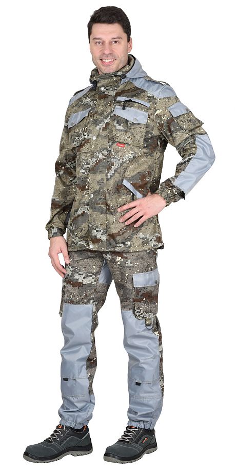 Куртка прямого силуэта с центральной застёжкой на молнию, с 2мя ветрозащитными планками, верхняя планка застёгивается на кнопки. С воротником стойка; с притачным капюшоном; с различными многофункциональными карманами: прорезными на «молнии», накладными с клапанами на «кнопках». Рукава с объемными налокотниками, вход локтевой вставки застегивается на «липучку». Ширина по низу куртки регулируется с помощью шляпной резинки и фиксаторов.Брюки прямые с застежкой гульфика на молнию, с притачным поясом стянутым, частично резинкой, с прорезными боковыми карманами на молнии, с накладными карманами с клапанами, с объемными наколенниками, с пуфтой. По низу, брюки стянуты резинкой.