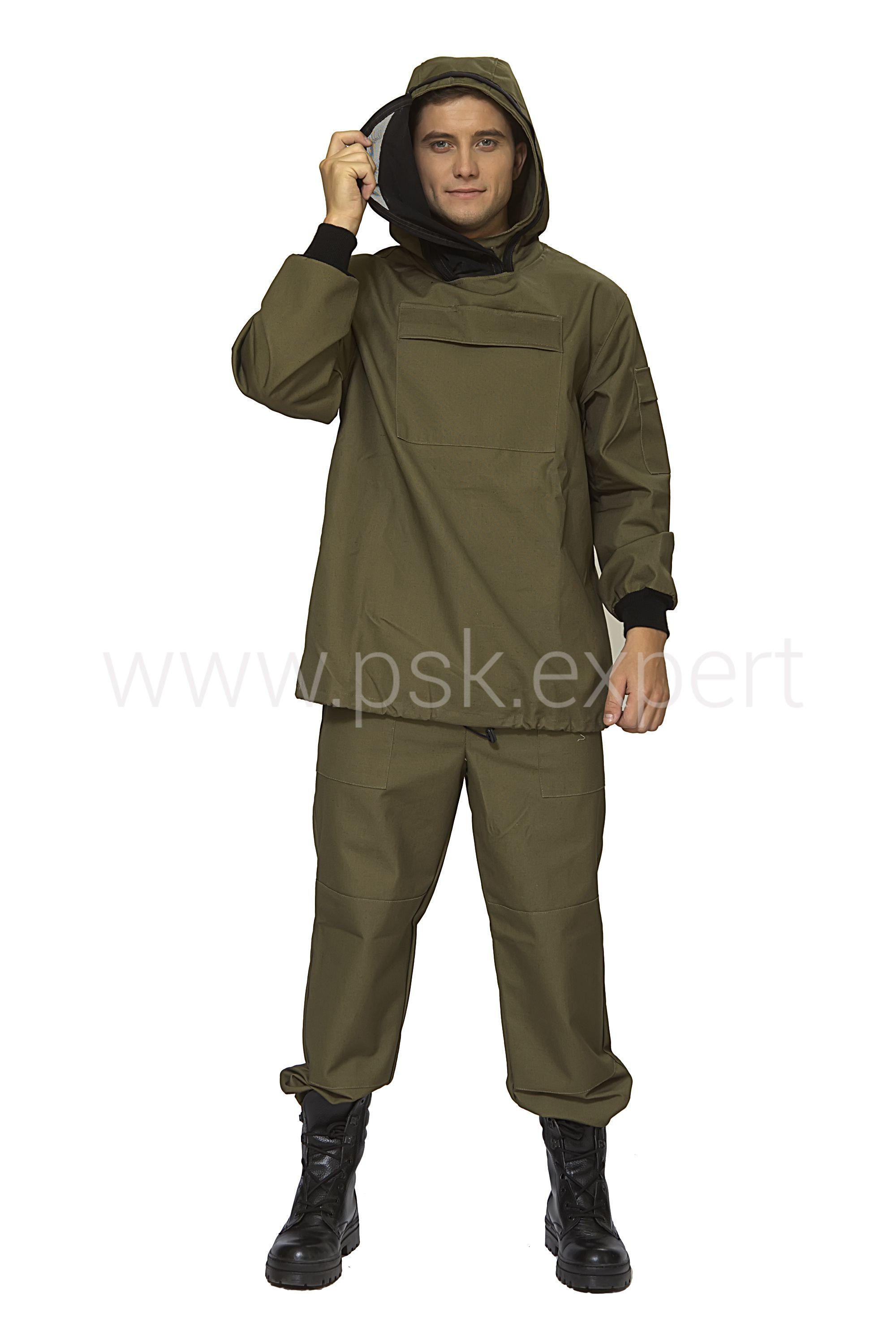 Куртка с притачным капюшоном с регулируемым объемом по лицевой части, с пристегивающейся на молнию противомоскитной сеткой, с нагрудным внутренним карманом для хранения сетки и большим карманом с клапаном. Ширина куртки внизу регулируется шнуром. Низ рукавов стянут эластичной тесьмой и трикотажной манжетой.