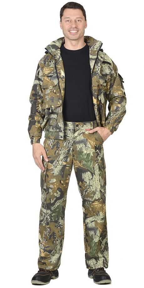 Куртка короткая, прямого силуэта, с центральной застёжкой на молнию накрытой ветрозащитным клапаном, воротник стойка, пристёгивающимся капюшоном, различными многофункциональными накладными карманами с клапанами. Рукава с манжетами и патой регулирующий ширину. Низ куртки с притачным поясом стянутым, частично, резинкой.Брюки прямые с притачным поясом стянутым, частично резинкой и застёгивающимся на пуговицу, со шлёвками, застёжкой гульфика на молнию, с различными функциональными карманами. Низ брюк регулируется эластичным шнуром.Ткань: смесовая 65% п/э, 35 % х/б, пл. 210 г/м.ГОСТ 12.4.280-2014