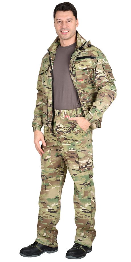 Куртка короткая, прямого силуэта, с центральной застёжкой на молнию накрытой ветрозащитным клапаном, воротник стойка, пристёгивающимся капюшоном, различными многофункциональными накладными карманами с клапанами. Рукава с манжетами и патой регулирующий ширину. Низ куртки с притачным поясом стянутым, частично, резинкой.Брюки прямые с притачным поясом стянутым, частично резинкой и застёгивающимся на пуговицу, со шлёвками, застёжкой гульфика на молнию, с различными функциональными карманами. Низ брюк регулируется эластичным шнуром.Ткань: "Рип-Стоп", ВО, 65% п/э., 35% х/б, 210 г/кв.м.ГОСТ 12.4.280-2014