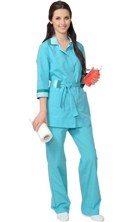 Тк. смесовая, 65% п/э, 35% х/б, 120 г/кв.м. Куртка на пуговицах, с поясом, карманами. Воротник, манжеты, шлёвки из отд. ткани. Резинка в поясе брюк. ГОСТ 9896-88, ТО.
