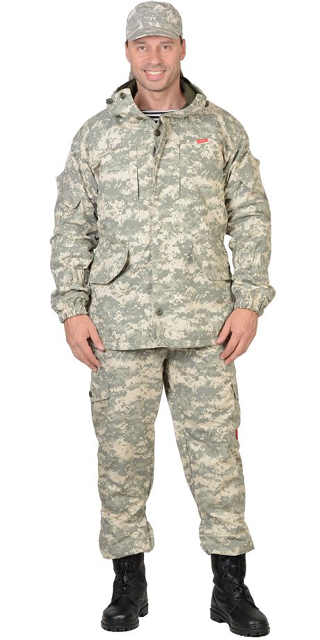 Куртка прямого силуэта, с центральной супатной застежкой на пуговицы, нижняя петля сквозная, с верхними карманами листочка на «молнию», с нижними карманами «листочка» с настрочными концами и фигурным клапанами на пуговицу, с внутренним карманом на «молнию». Рукава с полу объемными накладными карманами и фигурными клапанами на «липучку», с притачной нижней деталью на резинке, с налокотниками. Капюшон с козырьком, кулисами для регулировки, застежкой на пуговицы. По талии и низу куртки регулирует шляпной резинкой и фиксатором.Брюки с застежкой гульфика на пуговицы, пояс цельнокроеный на пуговицу, со шлевками, с резинкой по всей ширине цельнокроеного пояса, со съ.мными бретелями, с карманами в боковых швах, с задними накладными карманами застегивающиеся на пуговицу, с накладными карманами с объ.мом на боковых швах с фигурными клапанами на пуговицу, с наколенниками. Понизу брюк пуфта с завязками.ГОСТ 2595-2003Ткань смесовая «Рип-Стоп» 65% п/э, 35% х/б. Утеплитель:: «Флис» 100% п/э.