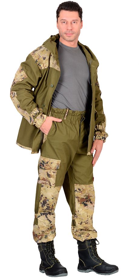Ткань:"Полотно палаточное": 100 % х/б, пл. 260 г/м.Куртка удлиненная прямого силуэта, с супатной застежкой на пуговицы, с втачным капюшоном с козырьком, с усилительными накладками, с прорезными карманами листочка и фигурными клапанами на пуговицу, с внутренним карманом. Рукава с накладными полуобъёмными карманами и фигурными клапанами на липучку, с манжетами частично стянутыми резинкой. Куртка по линии талии частично стянута резинкой, по низу куртка регулируется шнуром..Брюки прямого силуэта, с пристёгивающимися помочами (подтяжки), с гульфиком застегивающимся на пуговицы, с цельнокроеным поясом частично стянутым резинкой и застегивающимся на пуговицы, с разными многофункциональными карманами. С усилительными накладками. Низ брюк на резинке.ГОСТ 25295- 2003