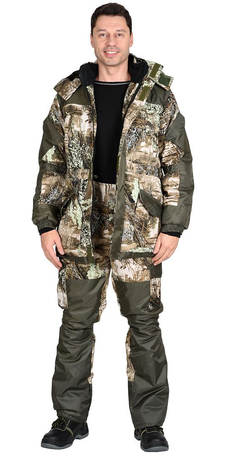 Куртка прямого силуэта с притачной утеплённой подкладкой, с центральной застёжкой на двухзамковую тёсьму - "молнию" и ветрозащитным клапаном застегивающийся на липучку, воротником - стойка, верхним прорезными карманами "листочка", с нижними накладными фигурными карманами антивор и фигурными клапанами застегивающиеся на канадскую пуговицу. Рукава с полу объемными накладными карманами и фигурными клапанами застегиваются на потайную липучку, с манжетами на резинке, с налокотниками. Капюшон с козырьком, двумя кулисами для регулировки, застежкой на потайную липучку. По талии регулируется шляпной резинкой и двойным фиксатором. Низ куртки регулирует шляпной резинкой и фиксатором. На подкладке внутренний карман на молнии.Брюки с центральной застежкой гульфика на три петли и пуговицы, с притачным поясом застежкой на две петли и две пуговицы, с пятью широкими шлевками, со спинкой и бретелями, с боковыми карманами с наклонным входом, с накладными карманами на боковых швах с фигурными клапанами застегивающиеся на канадскую пуговицу, с накладками передних половинок и накладками низа задних половинок.Ткань верха: "CROWN-230" камуфляжной расцветкм "Серый мох", с ВО пропиткой, состав 80 % - п/э, 20% х/б, пл. 230 г/м2.Отделочная ткань: "Оксфорд 210D" с ВУ пропиткой, состав 100 % - п/э.Утеплитель: синтепон - 120 г/м2 - 3 слоя (итого - 360 г/м2 в куртке).