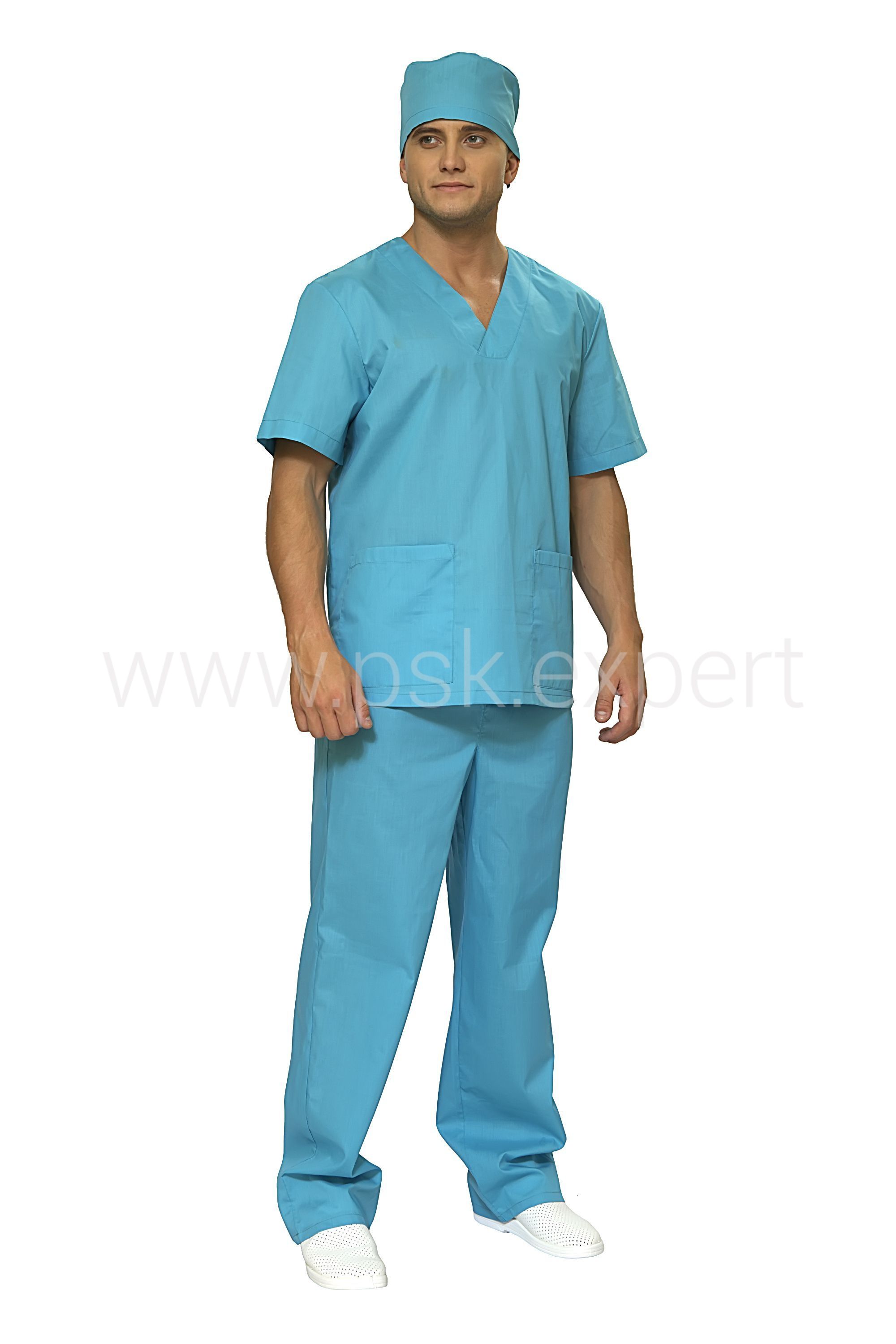 Блузон с V-образным вырезом горловины, накладными карманами и боковыми разрезами. На брюках объем по талии регулируется эластичной тесьмой. В комплектацию костюма входит чепец.