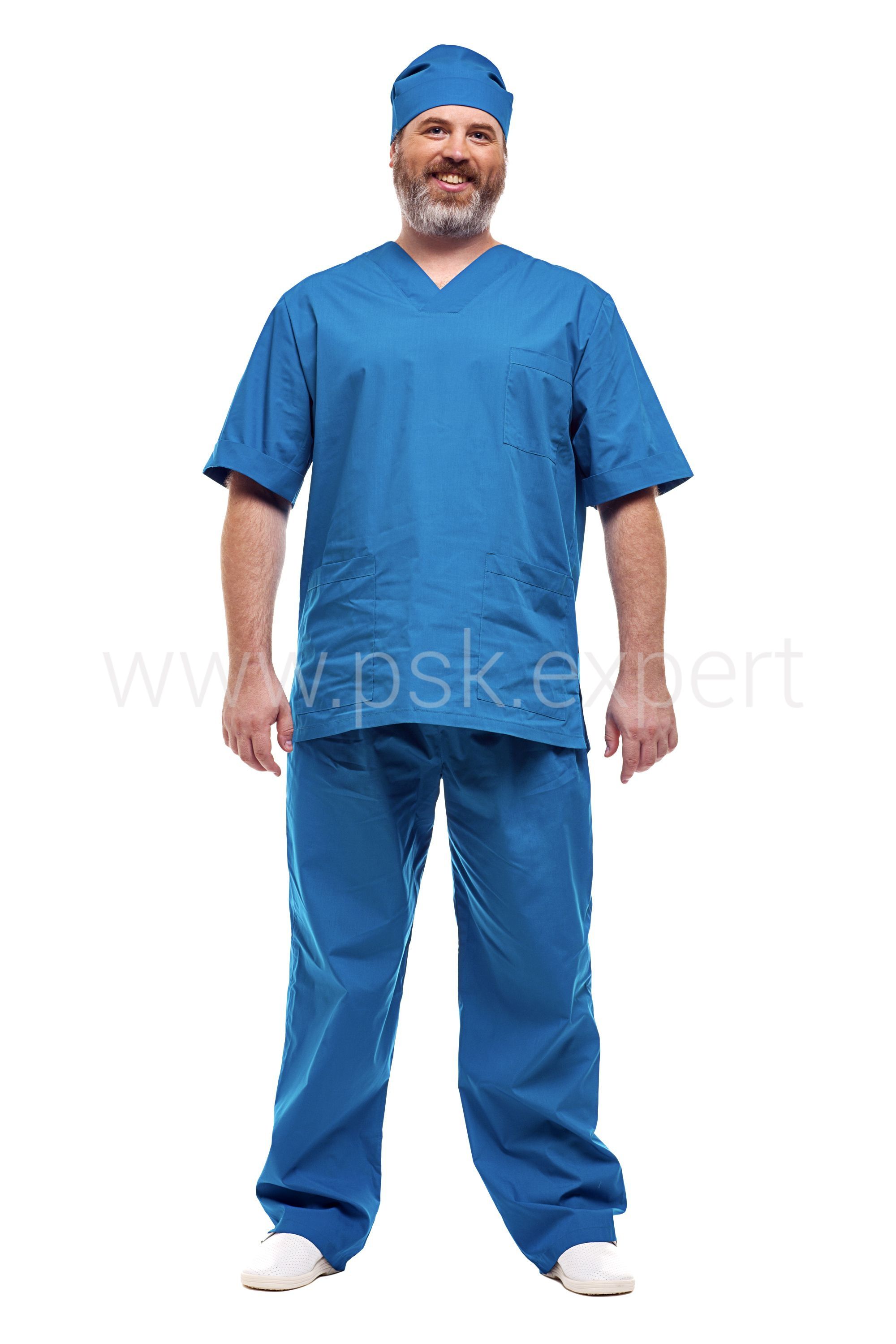 Костюм – блузон и брюки. Блузон с V-образным вырезом горловины, накладными карманами и боковыми разрезами. На брюках объем по талии регулируется эластичной тесьмой. В комплектацию костюма входит чепец.