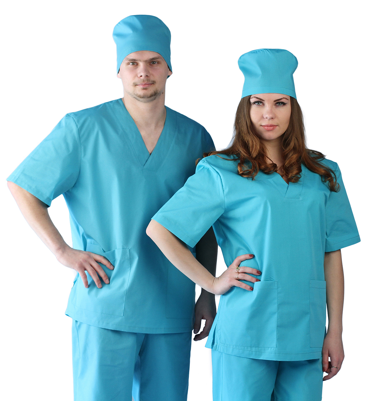 Комплект состоит из куртки, брюк и чепца. Блузон с V-образным вырезом и боковыми разрезами. На брюках объем по талии регулируется эластичной лентой.