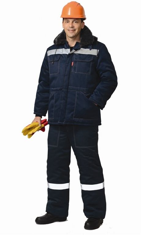 КУРТКА длинная с пристегивающимися на пуговицы утепленным капюшоном, отложным меховым воротником с хлястиком на пуговице, с центральной потайной застежкой на пуговицы, верхними и нижними накладными карманами. Рукава с внутренними трикотажными напульсниками. ПОЛУКОМБИНЕЗОН с центральной застежкой на "молнию" , накладными боковыми карманами, бретелями и эластичной тесьмой по талии спинки. На куртке и полукомбинезоне настрочены светоотражающие полосы 50мм для обеспечения безопасности работы в условиях пониженной видимости.ГОСТ 12.4.236-2011