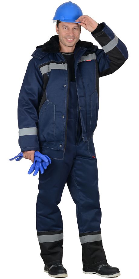 КУРТКА укороченная с отложным меховым воротником, с центральной застежкой на тесьму "молнию", накрытую ветрозащитным клапаном, застегивающимся на кнопки, притачным поясом частично стянутым резинкой. Рукава с внутренними трикатажными манжетами. ПОЛУКОМБИНЕЗОН с регулируемыми за счет эластичной тесьмы и фастексов бретелями, центральной застежкой на тесьму "молнию", с эластичной тесьмой по талии спинки, накладными боковыми карманами. На куртке и полукомбинезоне настрочены светоотражающие полосы 50мм для обеспечения безопасности работы в условиях пониженной видимости.ГОСТ 12.4.236-2011