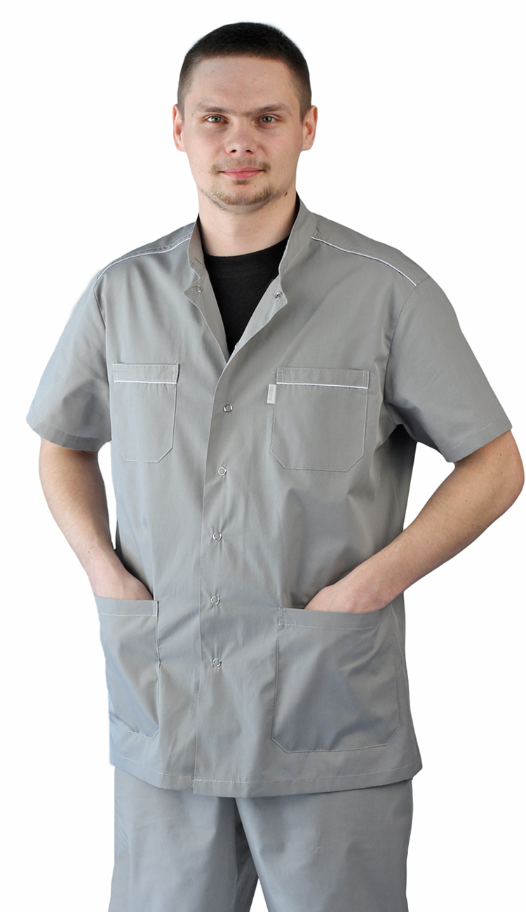 Блуза прямого силуэта, с центральной бортовой застежкой на кнопки, с воротником стойка, с верхними и нижними накладными карманами, с короткими, втачными рукавами. Кокетки и нагрудные карманы отделаны кантом контрастного цвета.