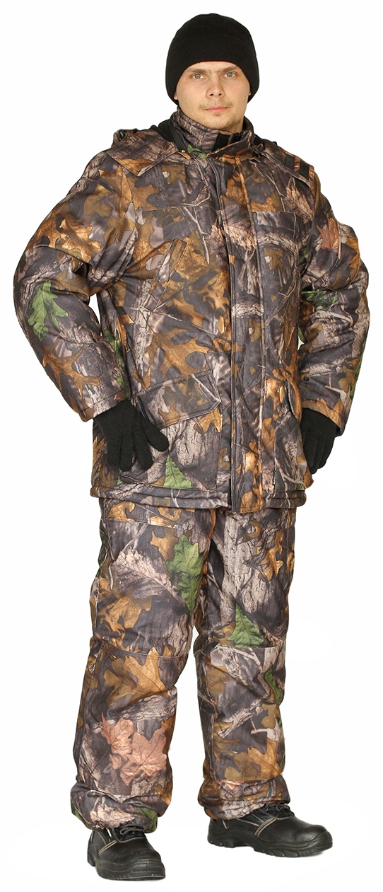 Камуфлированный универсальный костюм для охоты, рыбалки и активного отдыха при низких температурах. Не шуршит. Состоит из удлинненной куртки с капюшоном и полукомбинезона.